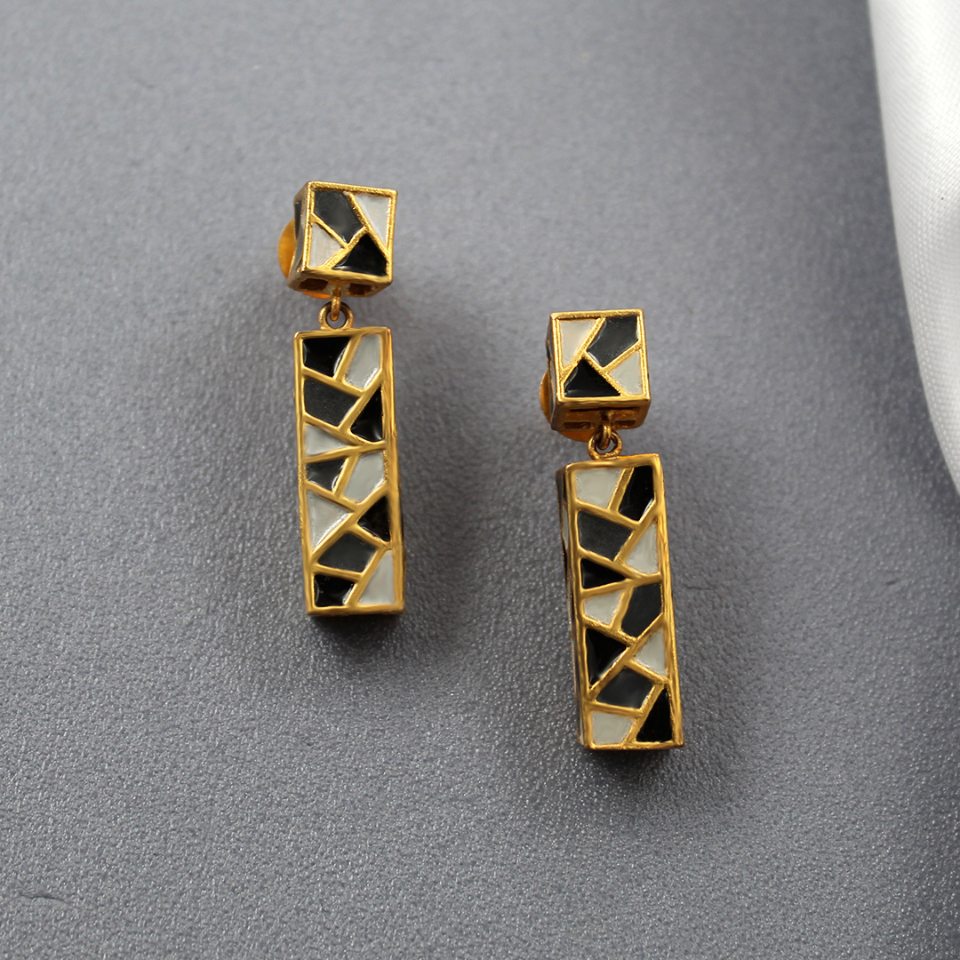 This earrings are inspired from Mosaic. They are Versatile, Handcrafted and Contemporary. It is 18K Gold plated made from brass metal. It is enamelled in the hues of Black