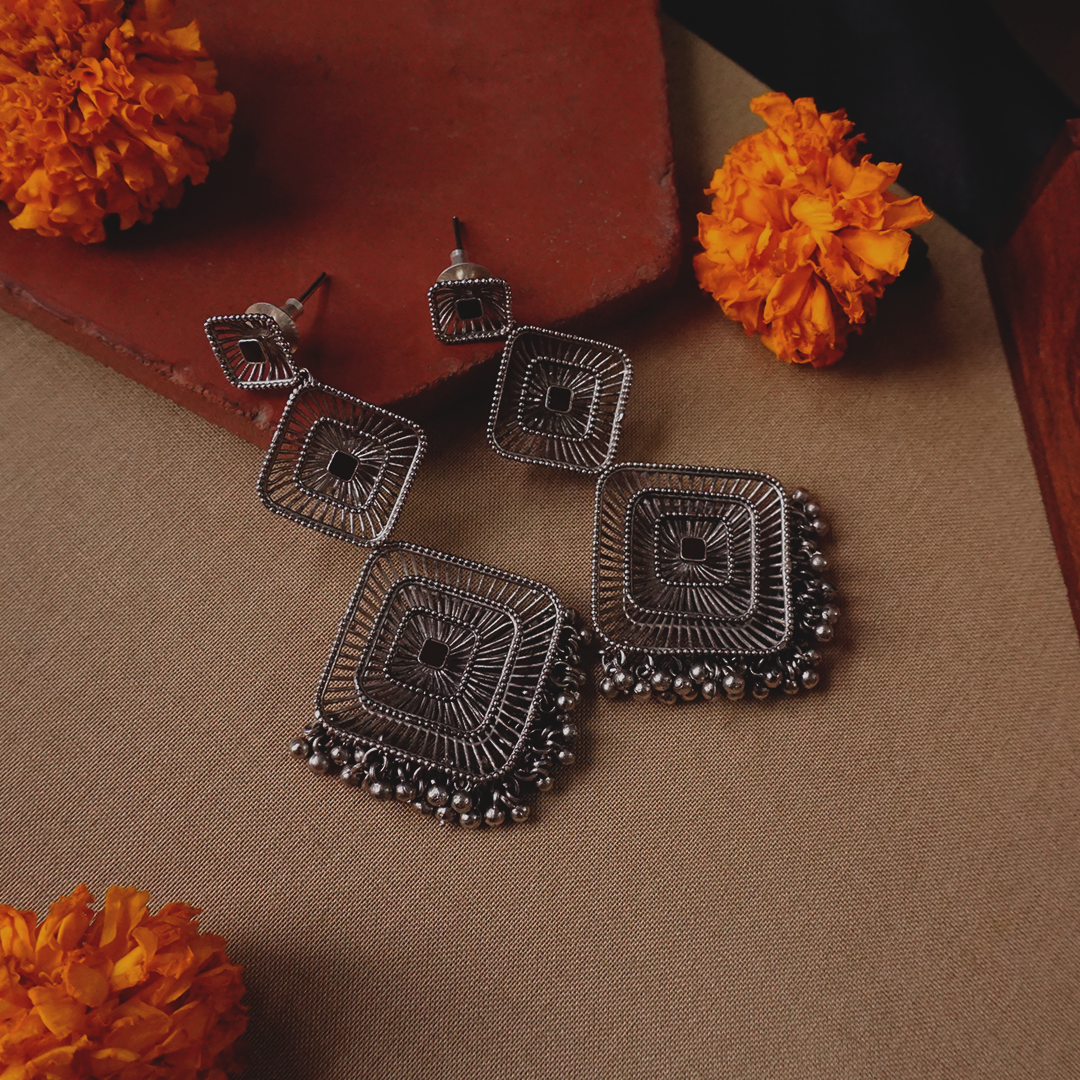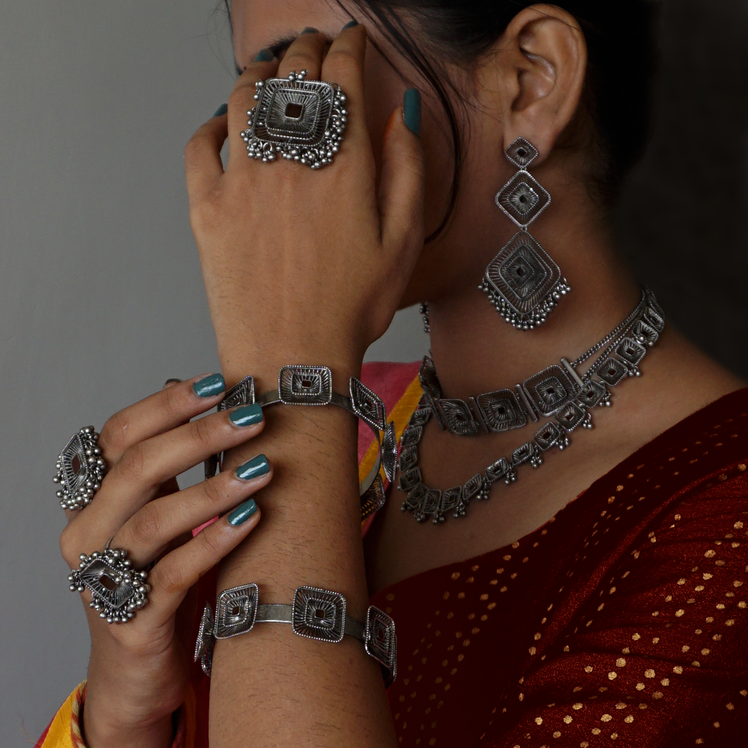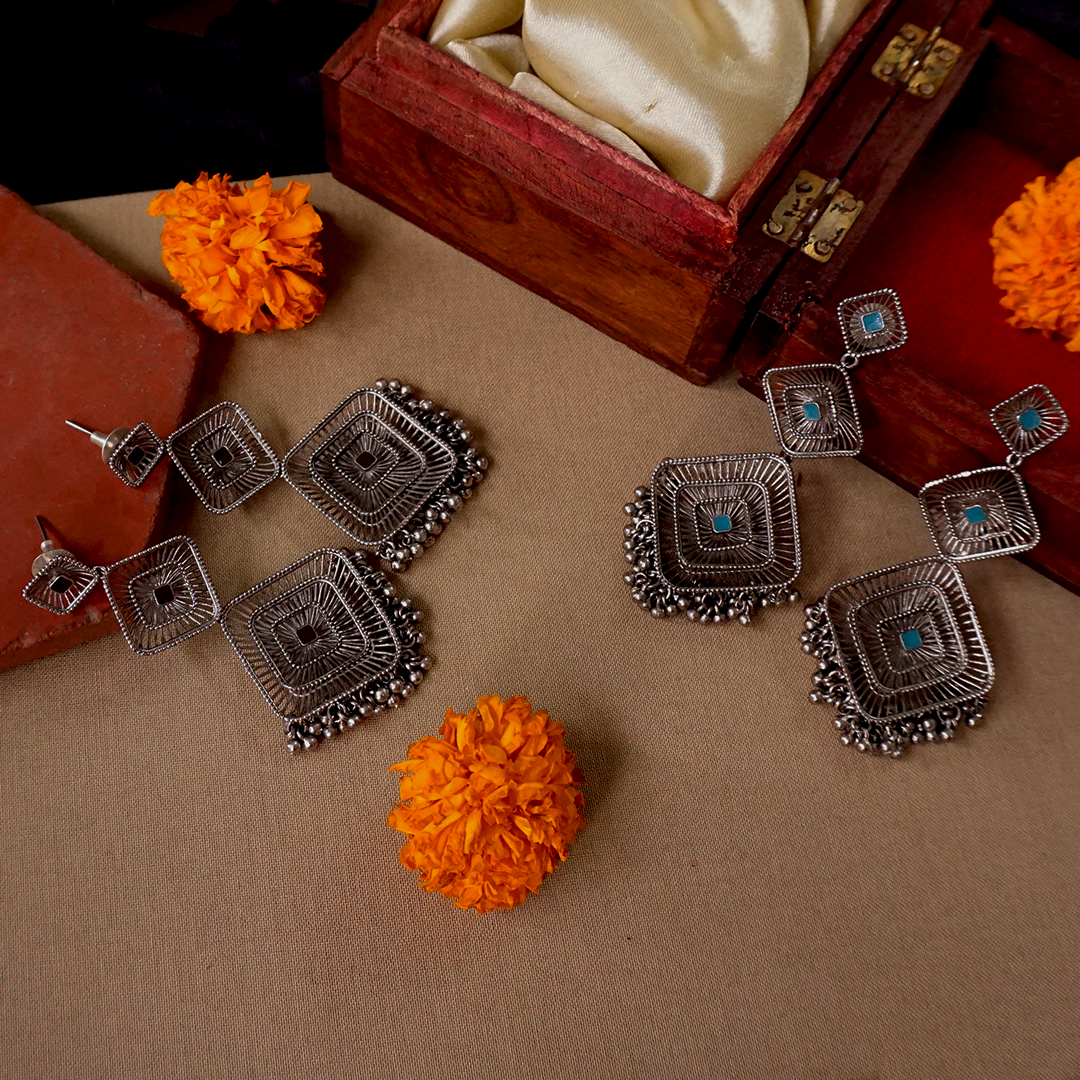 The earrings are handcrafted with precision designed thoughtfully for this festive season. Each piece is versatile and speaks for itself. The collection is silver plated made with brass metal with an oxidized finish.